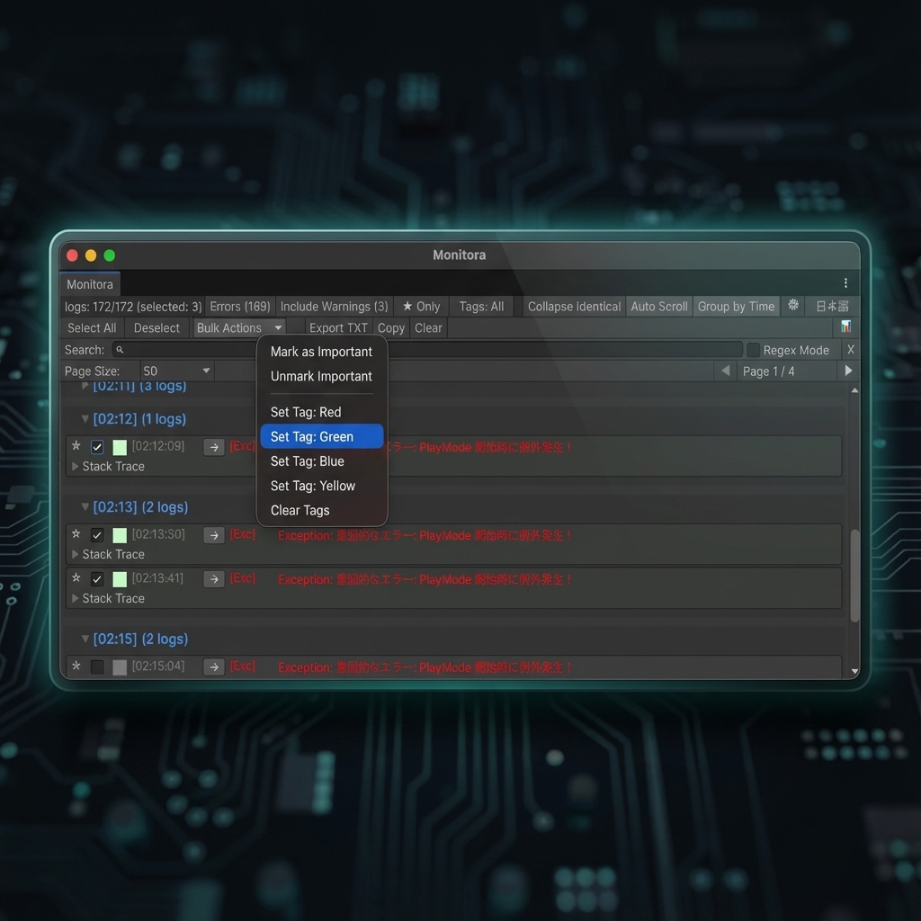 Logs are automatically grouped by timestamp (minute-based). "When did that bug happen?" "Is this error related to the last one?" Stop guessing. Monitora organizes 99+ duplicate logs into clean, collapsible groups. See exactly what is happening, and when, at a glance.