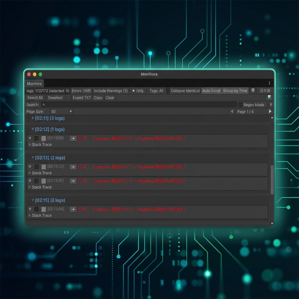 Cut through the noise with powerful Regex Search and one-click Warning Filters. Isolate the exact signal you need. Monitora presents only the errors that matter, exactly when you need to see them.